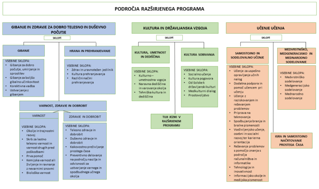 Kurikulum za razširjeni program osnovne šole je na voljo v Digitalni bralnici ZRSŠ na povezavi. Vsebuje najprej opredelitev temeljnega namena, načel in ciljev razširjenega programa. V nadaljevanju je predstavljena vsebinska zasnova razširjenega programa, ki je razdeljena na tri področja: